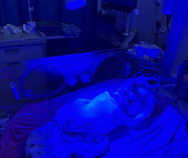 ^ Faith under the phototherapy lights. It was like she had her own little tanning bed! The blue lights also gave spaceship vibes.